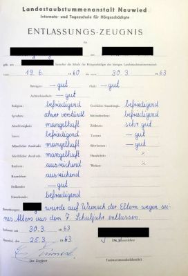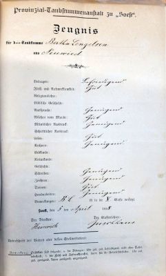 Auch Bertha Lengelsen hatte die Schule gewechselt. Sie kam aus Neuwied, ging aber auch auf die Provinzial-Taubstummenschule in Soest (Nordrhein-Westfalen).
